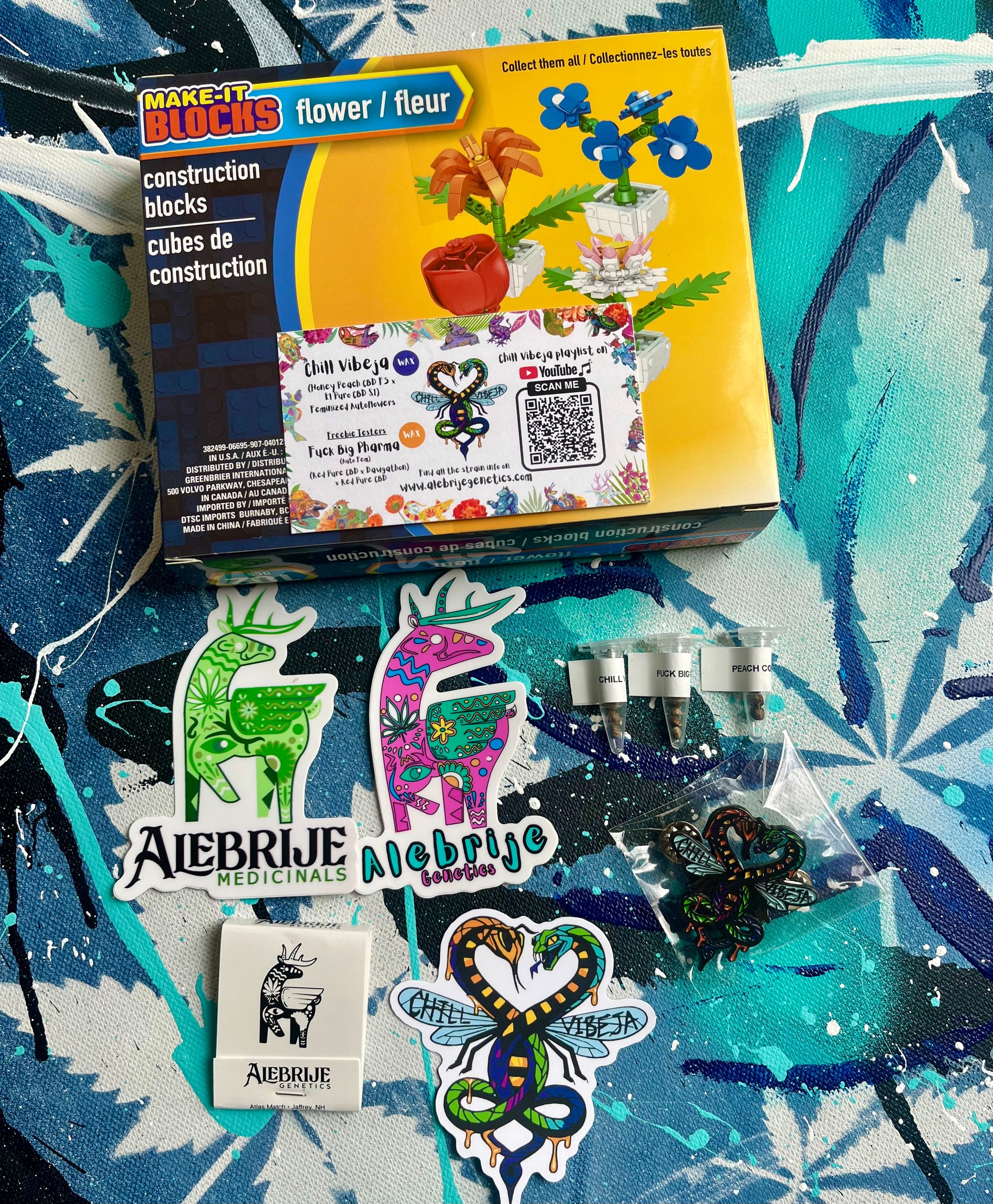 Discreet shipping inside children's toy kit. Includes 18 total auto fems (8x Chill Vibeja, 8x Fuck Big Pharma, 2x Peach Cobbler) plus enamel pin, stickers and matches.