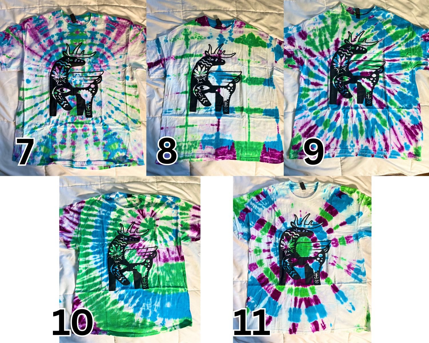 Size XTRA-LARGE 100% cotton 1 of a kind Tie Dye T-shirt by Mrs. Ganic with stealth Alebrije logo. Each shirt includes a freebie 3pk of Griswold Family Tree auto fems.